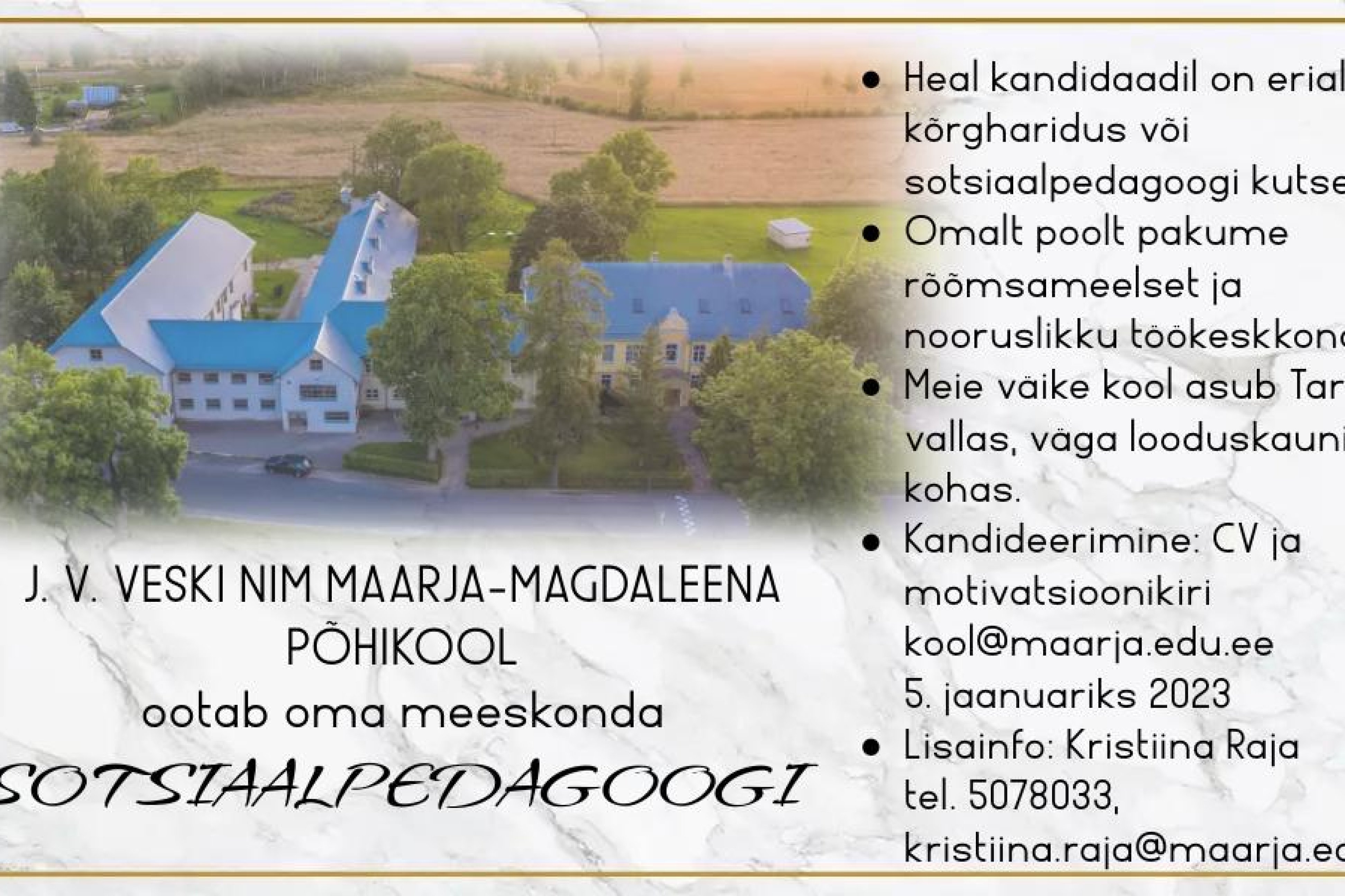 Kandideerimine: CV ja motivatsioonikiri kool@maarja.edu.ee 5. januariks 2023
